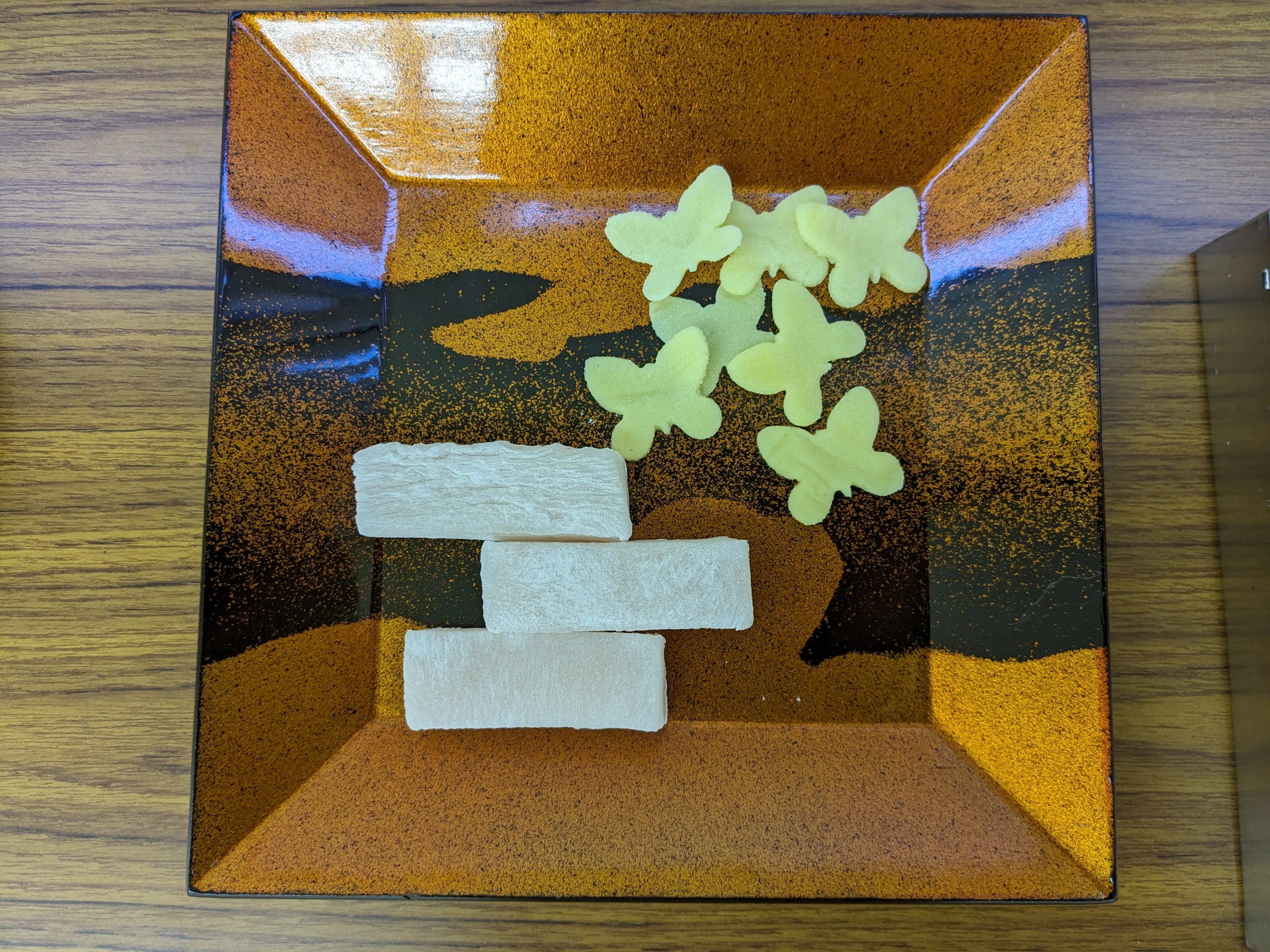 お菓子は砂糖菓子でちょうちょと羽衣二重橋。